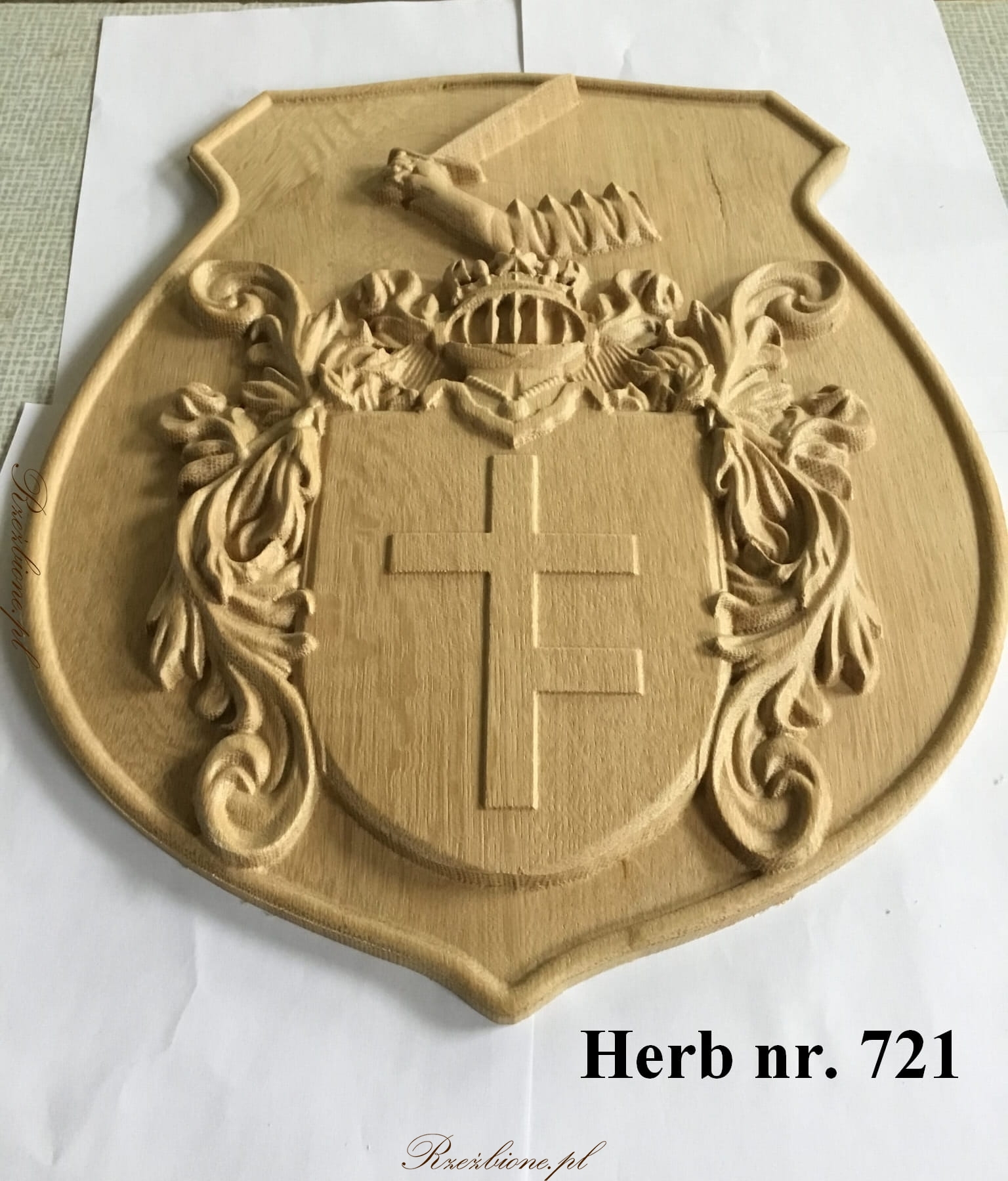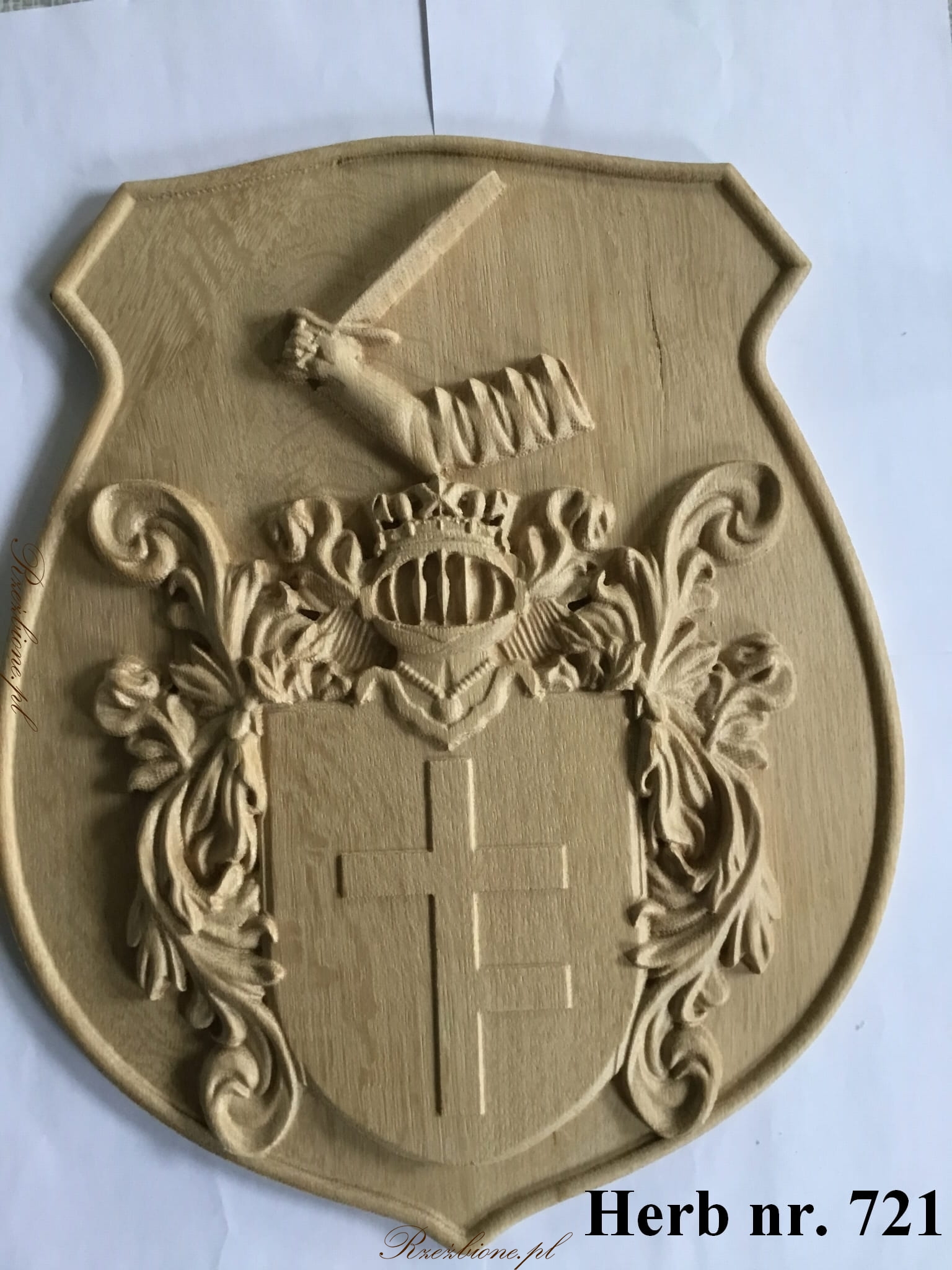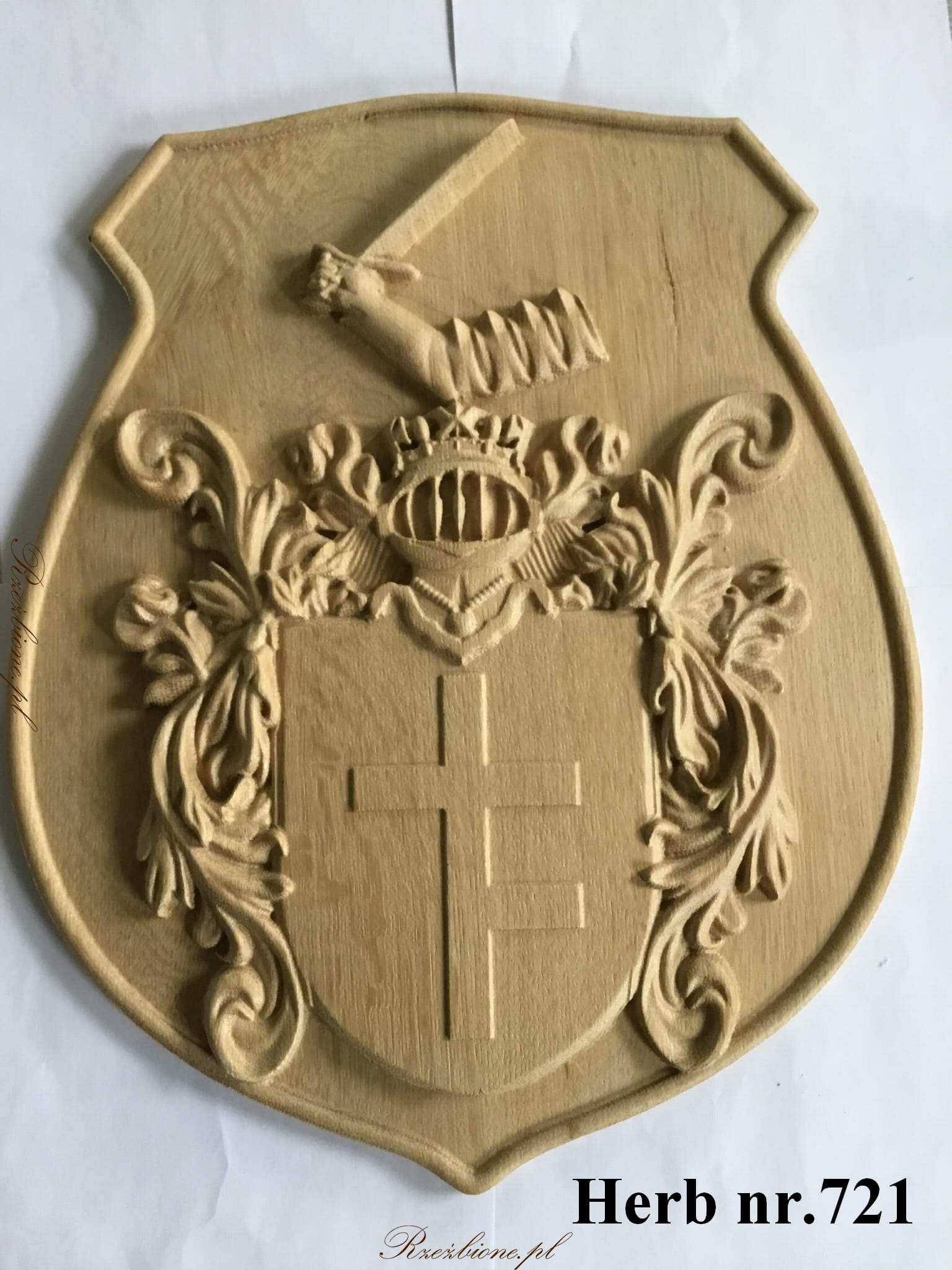 Herb został wykonany z drewna dębowego, specjalnie na zamówienie. Rzeźbione detale i precyzyjne wykończenie dodają mu elegancji i wyjątkowego charakteru.